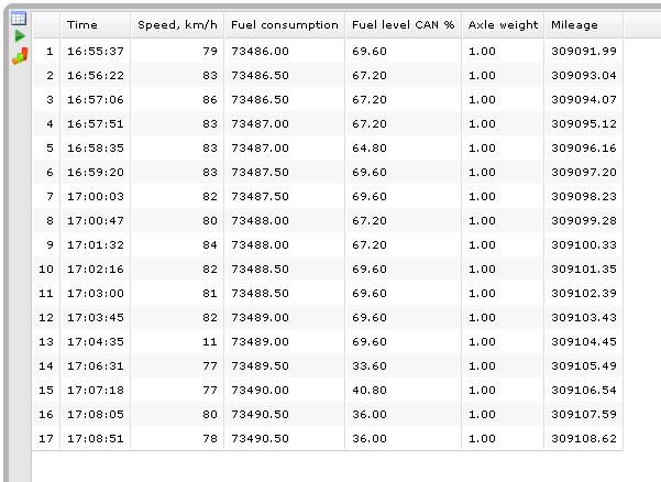 Data from the onboard computer are processed on the server and can be represented in tabular form: