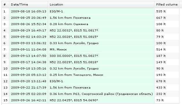 Time and place of gas stations (plum) is displayed in a tabular form indicating the number of filled (drained) of fuel: